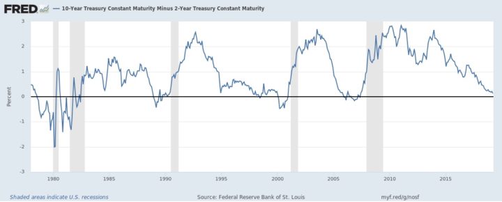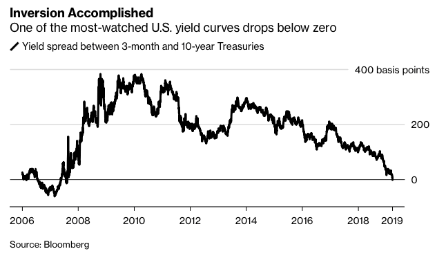 Last Friday, the yield on the 10-year US Treasury note was a tiny bit less than that of the 3-month US Treasury bill. This is known as a yield inversion, and depending on which article you read, this specific type of yield inversion (10-year minus 3-month) has happened before each of the past 6, 7, or 9 recessions. More overview in this Bloomberg article: