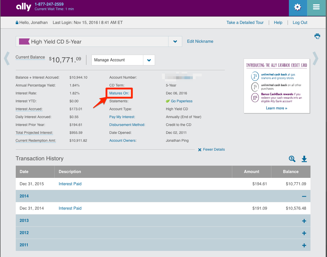 If you call them, they’ll ask you a bunch of identity verification questions, much more than other phone calls. You can also ask if they still offer a Loyalty Bonus where you’ll get an extra 0.05% APY if you renew your CD. I was not shown any such offer when renewing online. (The Ally Ten Day Best Rate Guarantee also applies.) If you want to make a withdrawal or other changes, they’ll ask you why. Nothing high pressure, but they’ll softly encourage you to renew.