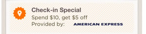 Check in at a merchant with a Special, load the Special to your card, and then pay for your over $10 purchase with your American Express ® Card. No need to show your phone to a cashier or anything – you’ll receive the credit on your Amex statement within 5 business days. You can find dozens of deals in your area just by hitting ‘Specials’ on the ‘Explore’ tab on your foursquare app (there are hundreds of thousands of participating businesses).