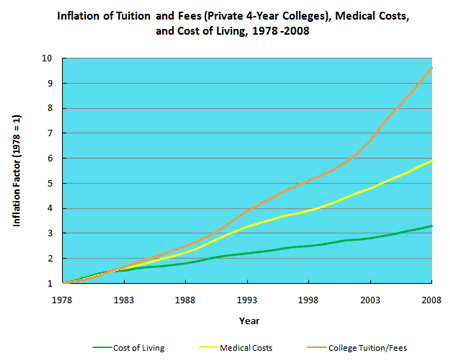 1. It would be interesting to know where all that money for tuition is going. Is it administration costs? building costs? professor costs? With the internet, it seems like the increase of cost should actually be less than the CPI.