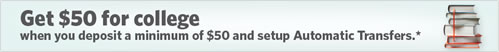 Here’s another 529 bonus that’s pretty easy to grab. (See Ohio 529 $50 bonus.) The FDIC-insured version of the CollegeInvest College Savings plan is currently offering a $50 bonus if you deposit $50 of your own money and set up automatic transfers. There is no minimum balance, and the terms only require a $1 monthly transfer for 6 consecutive months. Effectively, double your $50 to $100 in 6 months.