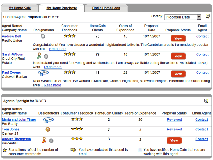 After browsing some newspaper ads, I decided to visit HomeGain.com and used their free “Find a Realtor” feature to compare some agents. You provide your information like neighborhood, price range, etc. and then a bunch of agents try to create a custom “proposal” for you. However, it’s all done online through their interface, and none of your contact info is shared without your permission. I liked the idea of not keeping my name and phone number private. You also get client testimonials and their experience level. Here is a sample (click for full size):