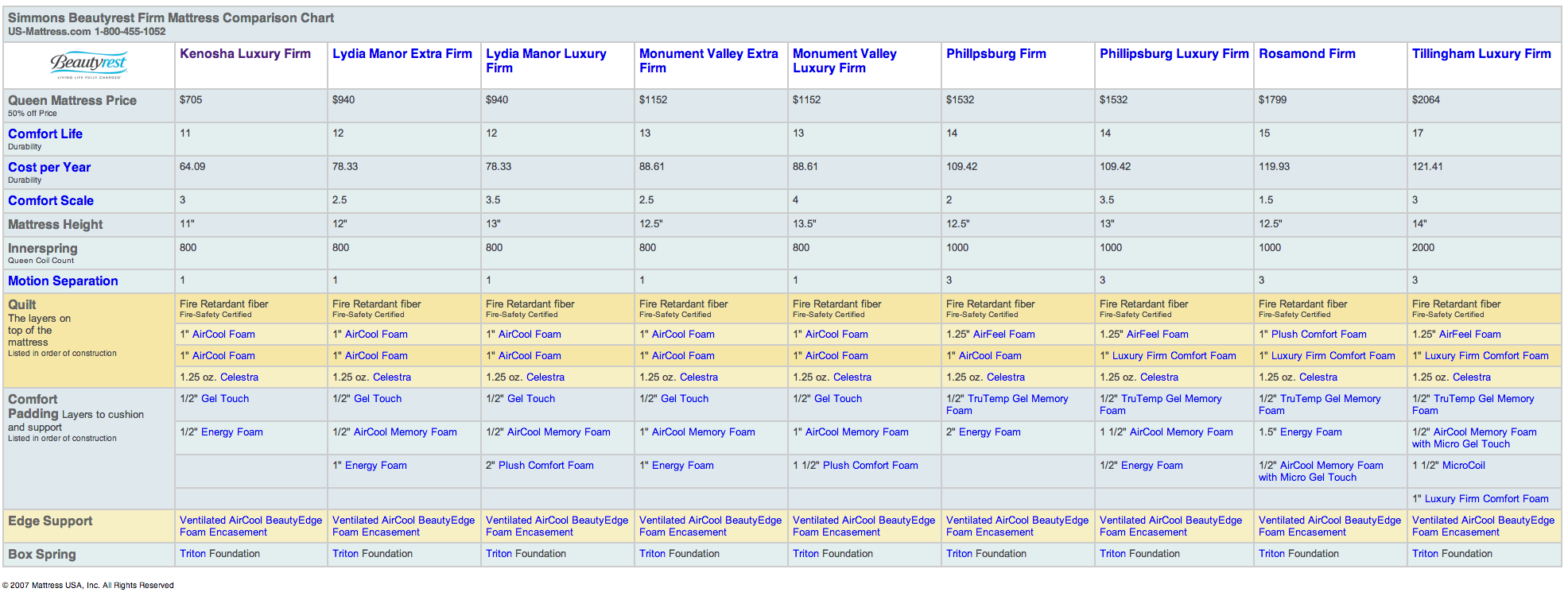 I decided to go back to a Simmons mattress and looked into buying online. Check out this comparison chart from US-Mattress.com: