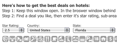 You provide them with the following: Star rating, Country, State, City, and Subarea (Neighborhood). Then you match up the little logos that show you what amenities the hotel offers, such as a fitness room, swimming pool, or free breakfast. The results have been hit or miss with me, although I found that it helps if you omit a few amenities if you get no matches. Hopefully their database gets better with time, although the site seems to have slowed down development.
