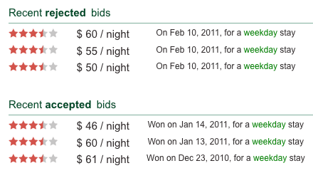 TheBiddingTraveler has you choose your hotel’s neighborhood (“zones”) along with the highest quality star-rating you want, and then provides you with some guidance as to what your starting bid and your final offer (the absolute highest price you’d be willing to pay). Recently rejected and accepted bids are provided, along with actual hotel names. Finally, the website actually walks you through the “optimal” bidding strategy, step-by-step.