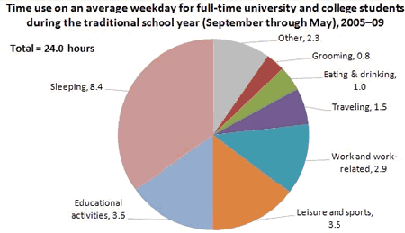 Is it 3.6 or 4.5 hours per day in ‘educational activities’? Average full time student would be spending about 3 hours a day in classes alone. Just 0.6 hours for study seems a little slim. Course I’m not sure I doubt it. I didn’t study much in college nor did the people around me.