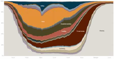 Here’s an interactive chart from the NY Times of how various groups of people spend their time over the course of a day.
