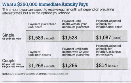 Below, the July issue of Money magazine included a nice graphic that helps show how each affect your possible payouts based on a $250,000 investment. Data is from ImmediateAnnuities.com, a handy site to get free quotes.