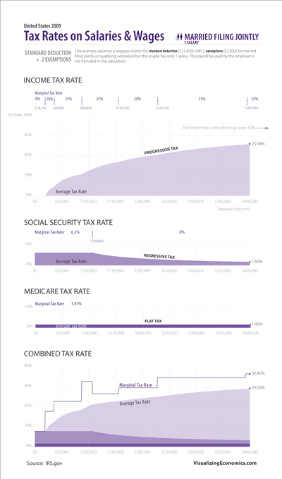 VisualizingEconomics has a nice series of infographics that explore how various income-based taxes change with your adjusted gross incomes. It uses 2009 IRS numbers, but should still remain relevant to today. Below is a snapshot of a married filing jointly couple with two kids and one income (click to enlarge):