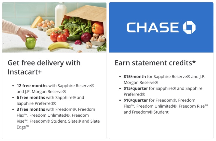 Chase has partnered with Instacart to offer a free memberships and credits to Instacart+. Instacart+ usually costs $9.99 a month (or $99 a year) and includes free delivery on $35+ orders and reduced service fees. They claim the average savings is $7 per order. Here are the eligible cards and perks: