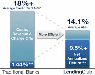 LendingClub.com (LC) is a website that securitizes person-to-person loans so that you can lend money to other people in as little as $25 increments, and you earn the interest. The idea is to replace banks and credit cards as the major middlemen used for lending. Here’s an illustration from their site:
