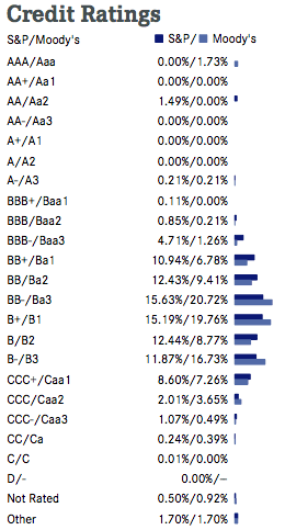 This is not a detailed analysis and not even technically an apples-to-apples comparison, but I ran some quick numbers to satisfy my own curiosity. The iShares iBoxx $ High Yield Corporate Bond ETF (HYG) is the largest high yield US corporate bond ETF, with over $15 billion in assets and an expense ratio of 0.50%. Here’s a chart of the credit rating breakdown of the portfolio, taken from their latest Q2 2013 factsheet.