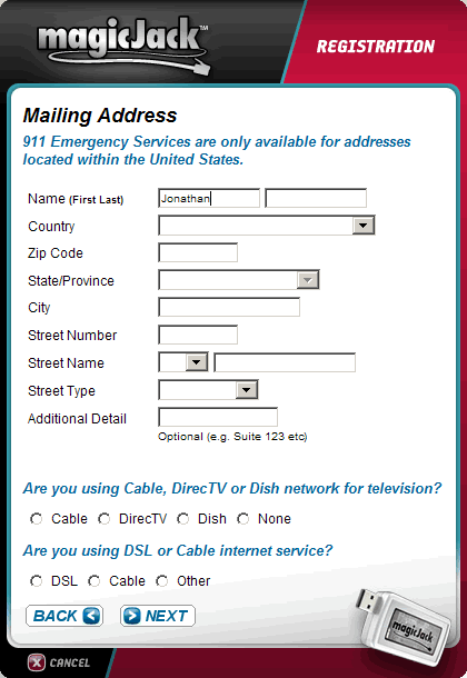 When I first plugged it in, nothing happened. The 1-page manual said “Take it out, and try another USB port.” I did that, and a small blue light on the MajicJack turned on, and it started to self-install on my computer. No CDs required. It proceed to make sure my firewall was configured correctly, and then asked me some personal address info for 911 service and also to pick my phone number.