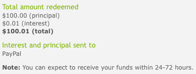 Investment #3: Called the Oikocredit Global Community Note, this investment enables loans to the working poor in several developing countries. 1.75% return per year, can redeem anytime. This last one is interesting because you can withdraw your principal at any time. I can already redeem only a day later: