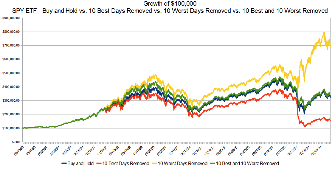 What this graph shows is that buy and hold does better than any market timing strategy. There is simply no way to identify the 10 best or 10 worst days. No one can do it, no matter what they say. All these great rules of thumb provided above have dramatic examples that break the rules.