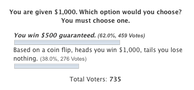 3. Based on a coin flip you win $1000 or lose nothing (change the wording to “you win an extra $1000 if you get heads, if tails you keep your $1000” and the votes change).