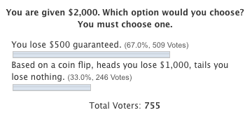 So if both polls are asking the same thing, a rational human being would answer both questions the same. However, psychologists have found that how the question is posed changes the answer. In the top poll, you start with $1,000 and are faced with either a sure gain or a bigger gain/nothing. In the bottom poll, you start with $2,000 and are faced with a sure loss or a bigger lose/nothing.