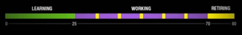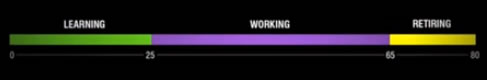 The inspiration came from the TEDtalk “The power of time off” by designer Stefan Sagmeister. Here’s a screenshot (sorry for the poor quality) illustrating the traditional working timeline: learn for 25 years, work for 40 years, then retire for 25 years.