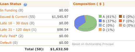 I now have made 62 active loans with $1,680.08 in outstanding principal. Most are A grade, with a decent spattering of Bs. Keep in mind that a borrower has to have a 660 credit score as well as other additional requirements just to make their lowest G grade. (Only about 10% of loan applications are accepted.) Although they do have an automated service to pick for you, I tend to pick my own loans to try and find both a combination of good risk profile and also a person who I want to help out. It’s kind of a hobby of mine. Here is a screenshot from my account page: