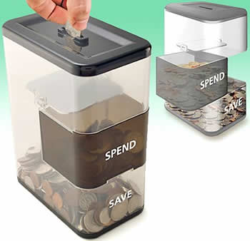 This might be cool for kids. The Spend Save Bank randomly deposits coins into either the ‘Save’ or ‘Spend’ section. It’d be even better if there was a option to set what percentages you want to split between spend and save, but I guess that would be a lot more complicated than a swiveling tray. Via Gizmodo via bookofjoe.