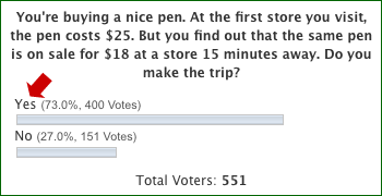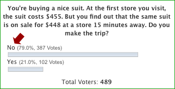 As you can see, the only difference between two questions is the original price of the item being purchased. In both cases, you are deciding whether you want to save $7 by spending 15 minutes of your time. $7 is $7. Or is it? The vast majority of readers would take the 15 minutes for a $25 pen, but the vast majority would also not spend the 15 minutes for a $455 suit.