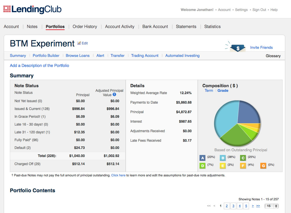 4. I learned some valuable lessons from Prosper when it came to P2P loans back in 2007. When you started your Lending Club experiment I also decided to give it another try using Lending Club instead, but made many changes to the way I picked loans. I ended up with 336 loans, spread out over A, B, and C rated borrowers only. The majority of loans issued were to B borrowers, A~32% B~65 C~3%. I’m 22 months into the loans and ended up with 2 charge-offs and 2 more that are over 30 days late, but other than that I have little complaints this time around. My adjusted return is at 8.97%, at least for now.