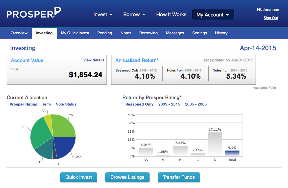 • I plan on liquidating the rest of my portfolio by the end of 2015. In June 2014, I still had $5,493 of principal in active loans in both LendingClub and Prosper. (The rest was idle cash, mostly withdrawn.) Now, roughly 10 months later, I only have $2,407 in principal and my total balance grew by a measly $67. $67 dollars! After filing my 2014 tax returns, I decided it was not worth the headache of dealing with the 1099s involved with these little loans. Thus, I plan on selling my remaining notes on the secondary market, probably soon but definitely by year-end. I might try again in the future inside an IRA, but for now I choose simplicity.