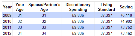 You input various financial information like income and assets, and the calculator will give you a “spending and saving plan” for each of the rest of your life. I think the most important column is savings: