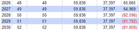Then at my chosen retirement age of 50, things change fast, with us starting to take large withdrawals from savings: