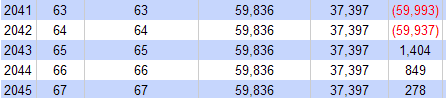 That’s be scary! Then, at age 65, the calculator assumes that Social Security will kick in, which almost has us at a zero savings rate.