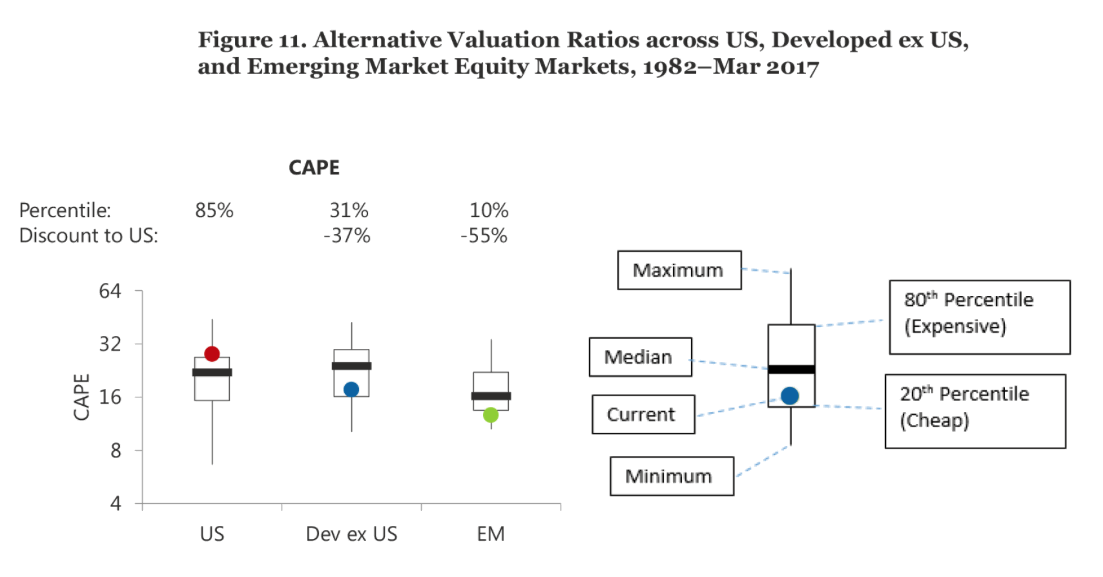 These numbers are not very useful as a timing to jump in and out of something. The US has been highly valued for a couple years, yet returns for those last two years have also been quite high. However, Research Affiliates maintains that CAPE and similar valuation tools are a powerful predictor of long-term market returns.