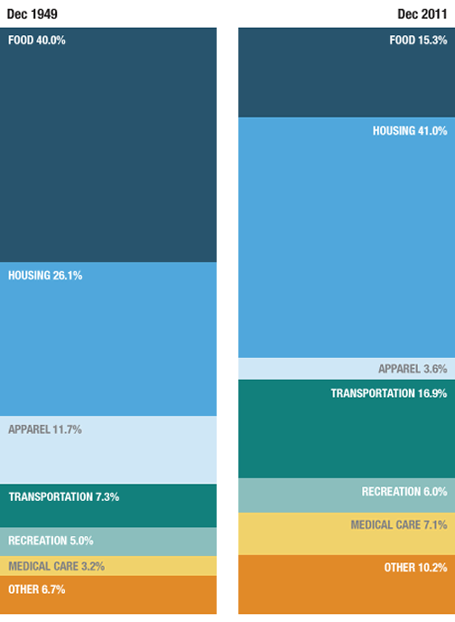 To begin with, improvements in agricultural practices have made many commodities cheaper now than before. At the same time, it appears that food has been squeezed by other “needs” like shelter, transportation, and healthcare which now take up a much larger portion of our budget. Here is a more complete spending breakdown from this NPR article.
