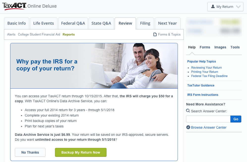 5. So I need to send in prior year tax returns and W-2s to apply for a mortgage and I am wondering if I sign up for Taxact Deluxe, will I be able to access and download all of them? Just thinking that would save a lot of time over scanning them, but I can’t figure out if this is included in Deluxe or if I would need to pay for the Data Archiving Service instead.