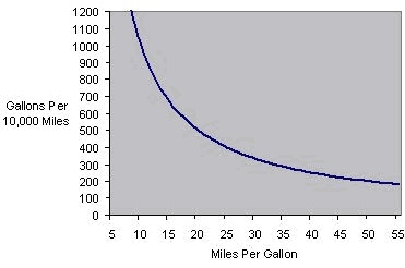 If you remember gallons = $$, this chart below shows (also from MPG Illusion), the savings you get from going from 10 mpg to 20 mpg is a lot greater than going from 30 mpg to 40 mpg. In fact, going from 16 to 20 mpg can save as much gas as the shift from 31 to 50 mpg.