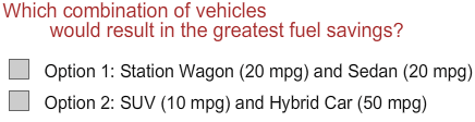 Okay, a little math. Getting 10 miles per gallon is the same as saying you use 10 gallons every 100 miles. 20 mpg means 5 gallons every 100 miles. 50 mpg means 2 gallons every 100 miles. So in one week, the Option 1 uses 10 gallons per week. Option 2 uses 12 gallons per week. Option 1 wins!