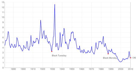 @DGI – Thanks for the link, here’s another chart of the S&P 500 dividend (inflation-adjusted) since 1881-2010, which includes the recent market drops: