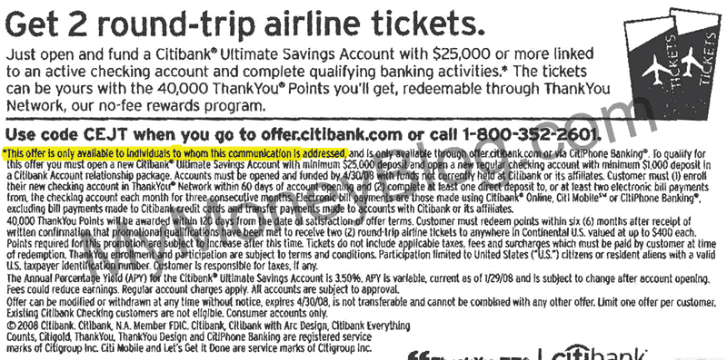 If I open up a new Citibank Ultimate Savings account + Checking account with at least $25,000 by 4/30 and complete a direct deposit for 3 consecutive months, I can get 40,000 ThankYou Points which can be converted into two roundtrip airlines tickets worth up to $400 each. Here is a scan of the offer. Offer code is CEJT. However, note the very first line states that “this offer is only available to individuals to whom this communication is addressed”, so please check your statements and save it to avoid hassles later. I would think most others would get it as well, since I am probably one of Citibank’s less-profitable customers and I got it. 😉