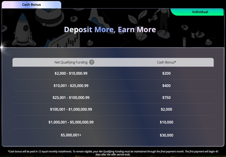 Stacking example: If you deposit $10,001 in new funds (and invest it there for 13-15 months) and pay $40 for a year of Webull Premium, you can get both a $400 deposit bonus and 12 months of WSJ. With Webull Premium, you also make available 4.1% APY on cash sweep, 3.5% bonus on IRA contributions, and 3% bonus on IRA transfers (5-year minimum hold period for both). I’m more here for the short-term promos though, as I’m not a big fan of Webull customer service in general.