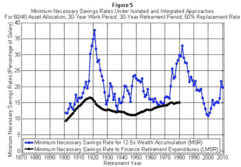 Reader Dave thoughtfully sent me an interesting Financial Advisor magazine article about an upcoming academic paper by Dr. Wade Pfau that takes a look at this from another angle. What if you wanted to figure out a “Safe Savings Rate”?