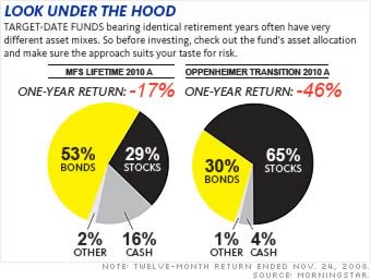 On the aggressive side, the Oppenheimer Transition 2010 Fund (OTTAX) has 65% in stocks for someone on the verge of retirement, resulting in a 46% loss in 2008. On the conservative end, this AP article has an even better example – The DWS Target 2010 Fund (KRFAX) only has 18.1% in stocks and only had a 3.6% loss in 2008. The rest was in cash and bonds. (Of course, it also had a fat front-end load and is closed to new investors.)