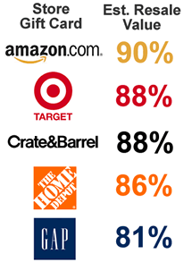 As one might have guessed, Amazon.com has the highest resale value, as you can easily spend it online, and they sell everything from groceries to bedding to electronics. Big Box stores Target and Home Depot followed closely behind. Surprisingly, even with a limited presence and fancier products Crate and Barrel also did quite well. My theory behind this is that people tend to spend a lot of money there, so people can buy a bunch of gift cards online, combine them, and still save a large amount – 12% off of $1,000 is $120 saved.