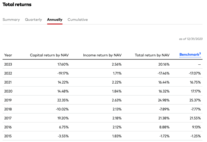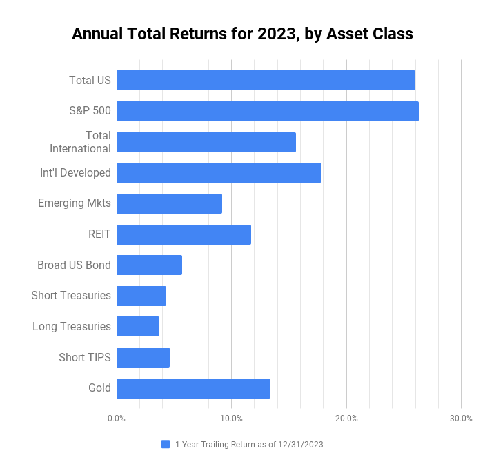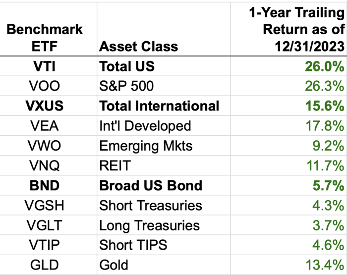 Happy New Year! 🎉 🥳 It’s time to take a look back and see how the year went for the broad asset classes that I track. Per Morningstar, here are the total annual returns (includes price appreciation and dividends/interest) for select asset classes as benchmarked by popular ETFs after market close 12/29/23.