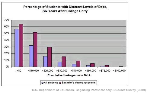 The NY Times Economix blog had a provocative post a few days ago about student loan debt, pointing out a government study that showed that 90% of bachelor degree holders had less than $40,000 in student loans shortly after graduating.