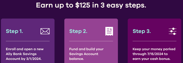 Ally is running a new up to $125 deposit bonus by referral only (that’s mine). You get a 0.50% cash bonus on new money deposited (3/29/24 to 7/15/24) on top of their standard interest rate. Here are the details, direct from the offer page: