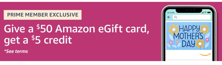 Amazon is offering Prime members a $5 credit when you buy a $50 Amazon eGift card as part of their Mother’s Day promotions. You must activate on the offer page first before it will show up on your account. 10% off, not bad. There a limited number of redemptions.
