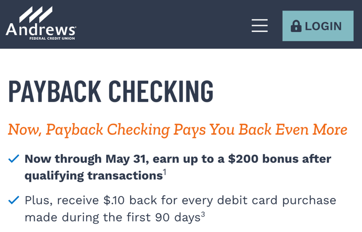 Andrews Federal Credit Union has a $200 PayBack Checking offer with qualifying direct deposits to a new checking account. Offer expires 5/31/23. Here is the breakdown of the bonus: