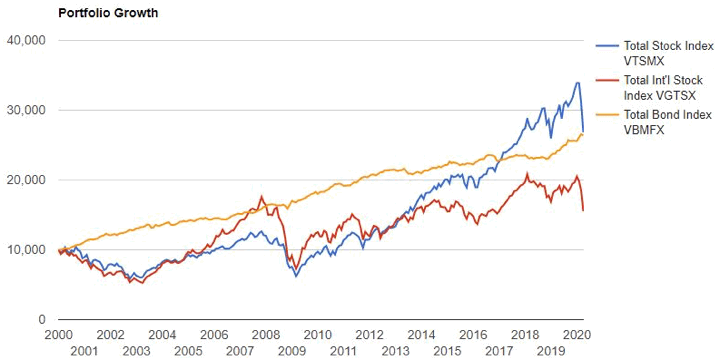 If you can take it, here is some more humbling food for thought. Here is a comparison of the growth of $10,000 invested in either the Total US stock, Total International Stock, or Total US bond index fund from the beginning of this century (1/1/2000) until the end of last week. The story is the same if you compare the S&P 500 and the US Aggregate Bond Index total returns. Via Allan Roth and the WSJ article Bonds Are Now Outperforming Stocks in Battle for Returns This Century.