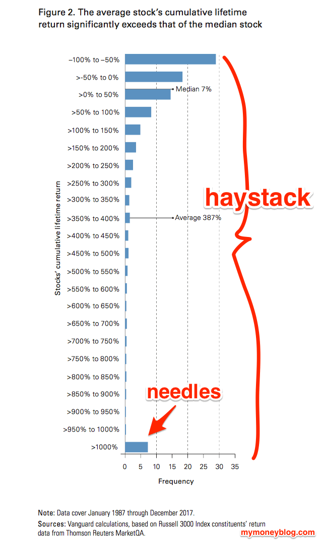 2. Trying to find a needle in the haystack means you have to get lucky three times — one to find the needle, two to buy the needle, and three to sell the needle at the right time. I wholeheartedly agree there’s no need take these huge risks when you can just buy the whole haystack.