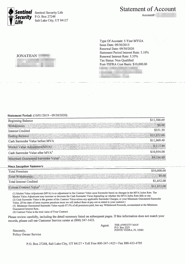 I’ve written a little about about Multi-year guaranteed annuity (MYGA) fixed deferred annuities in the past, and I actually bought one as one of my “$10,000 Experiments” way back in 2015. I bought the MYGA with the highest available interest rate at the time from a company called Sentinel Security Life. Owning a MYGA is very quiet, I only get a mailed statement once a year and the only action required is to roll it over every 5 years. In 2020, Sentinel still offered the highest rate, so I rolled it over to them again. More quiet…