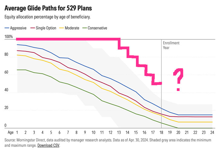 Most 529 owners use the age-based or target-enrollment portfolios from their plan provider. Some only offer one flavor, while others split it into “conservative, moderate, and aggressive” versions. Morningstar analyzed them all in their 529 landscape report and found that they start on average with ~90% stocks and “glide” down to ~16% stocks when the beneficiary turns age 18. Up top is their graphic of average glide path.